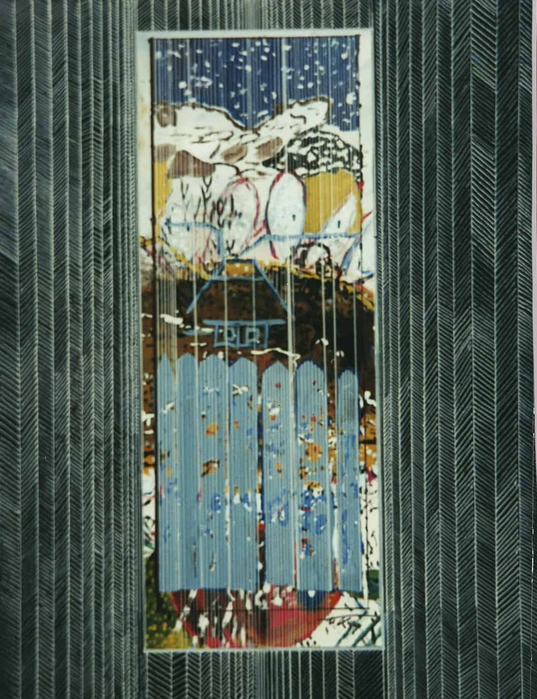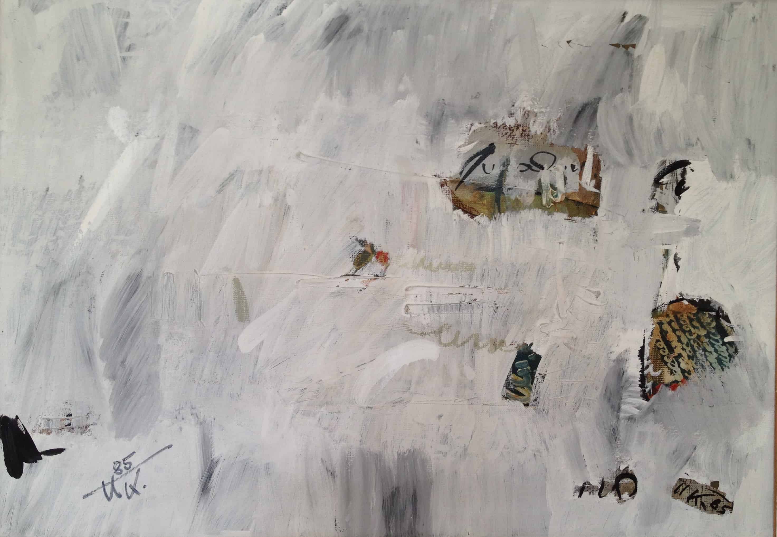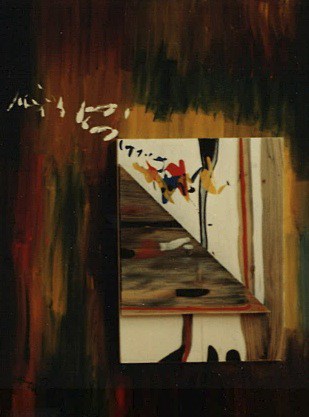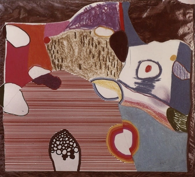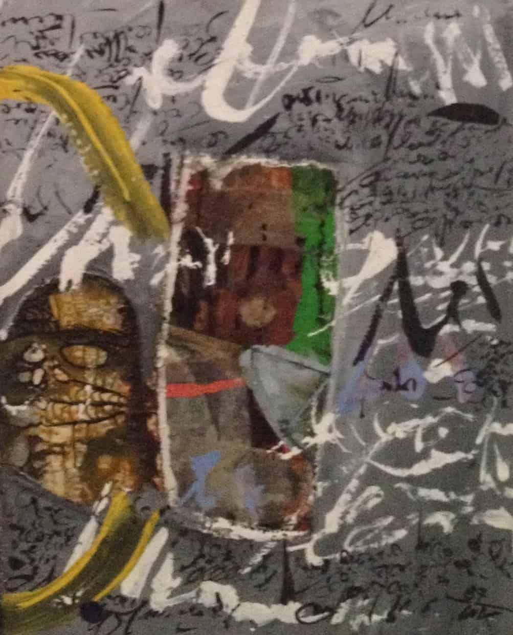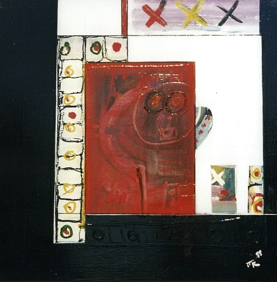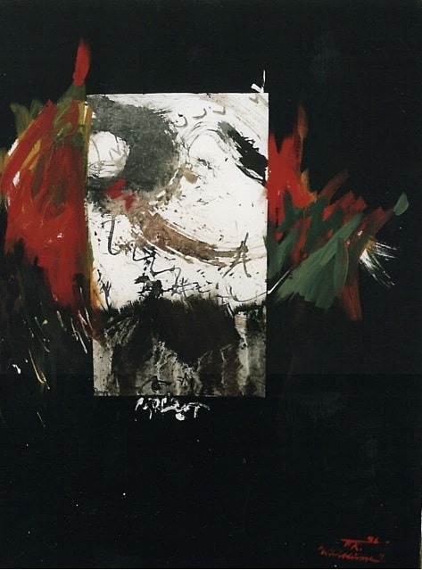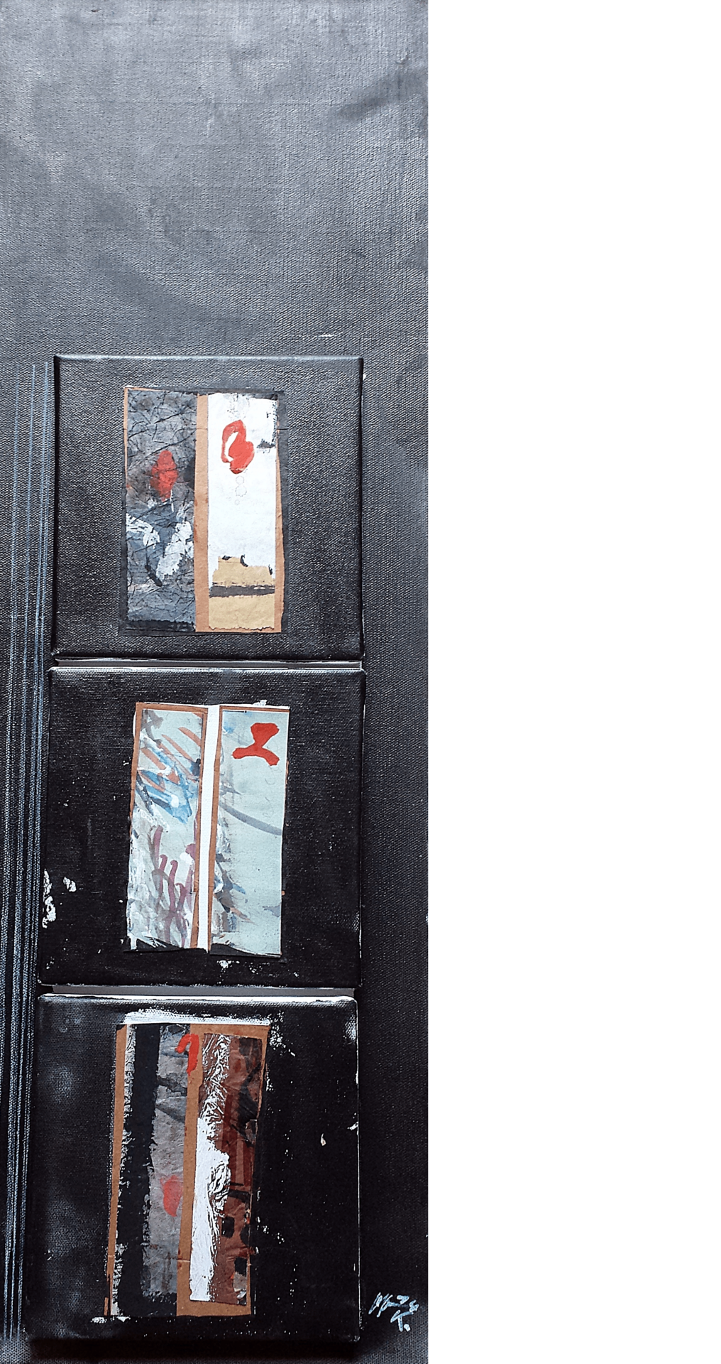 Technik: bunter Farbcollage auf weißgestrichenem Packpapier, dieses geklebt auf mit Tusche schwarz grundierte Leinwand