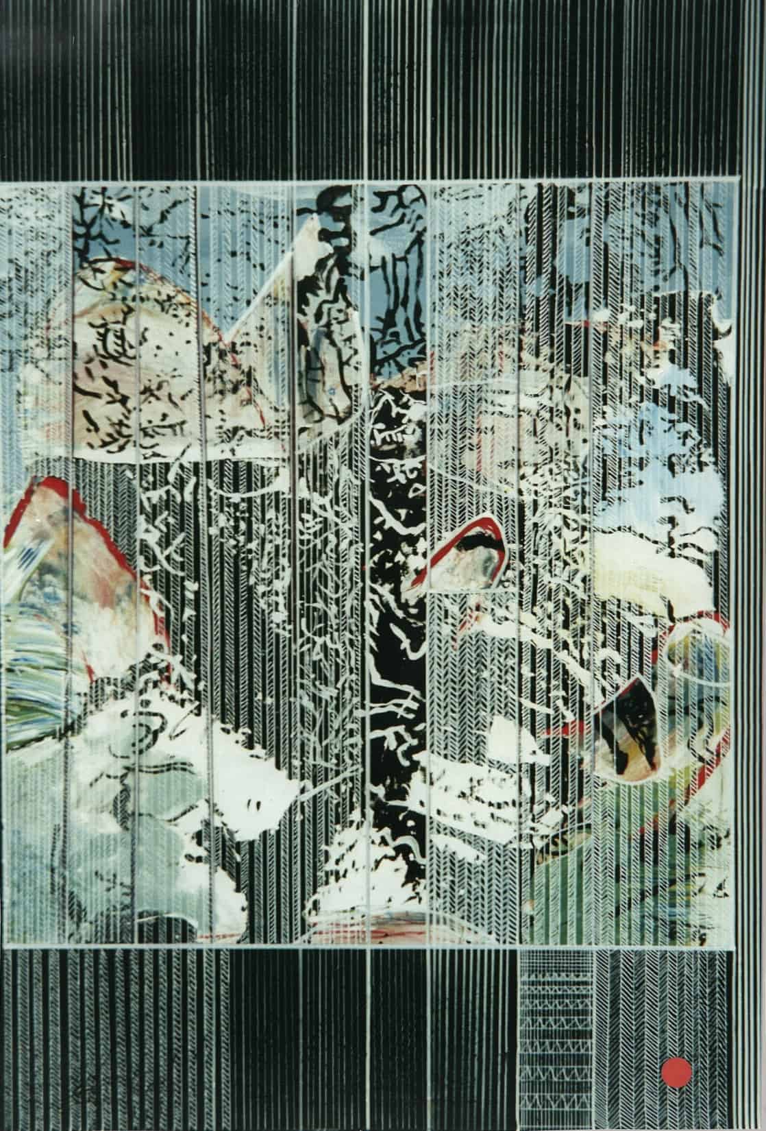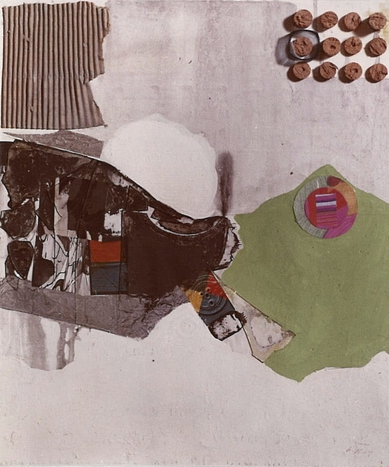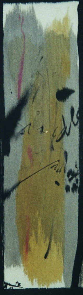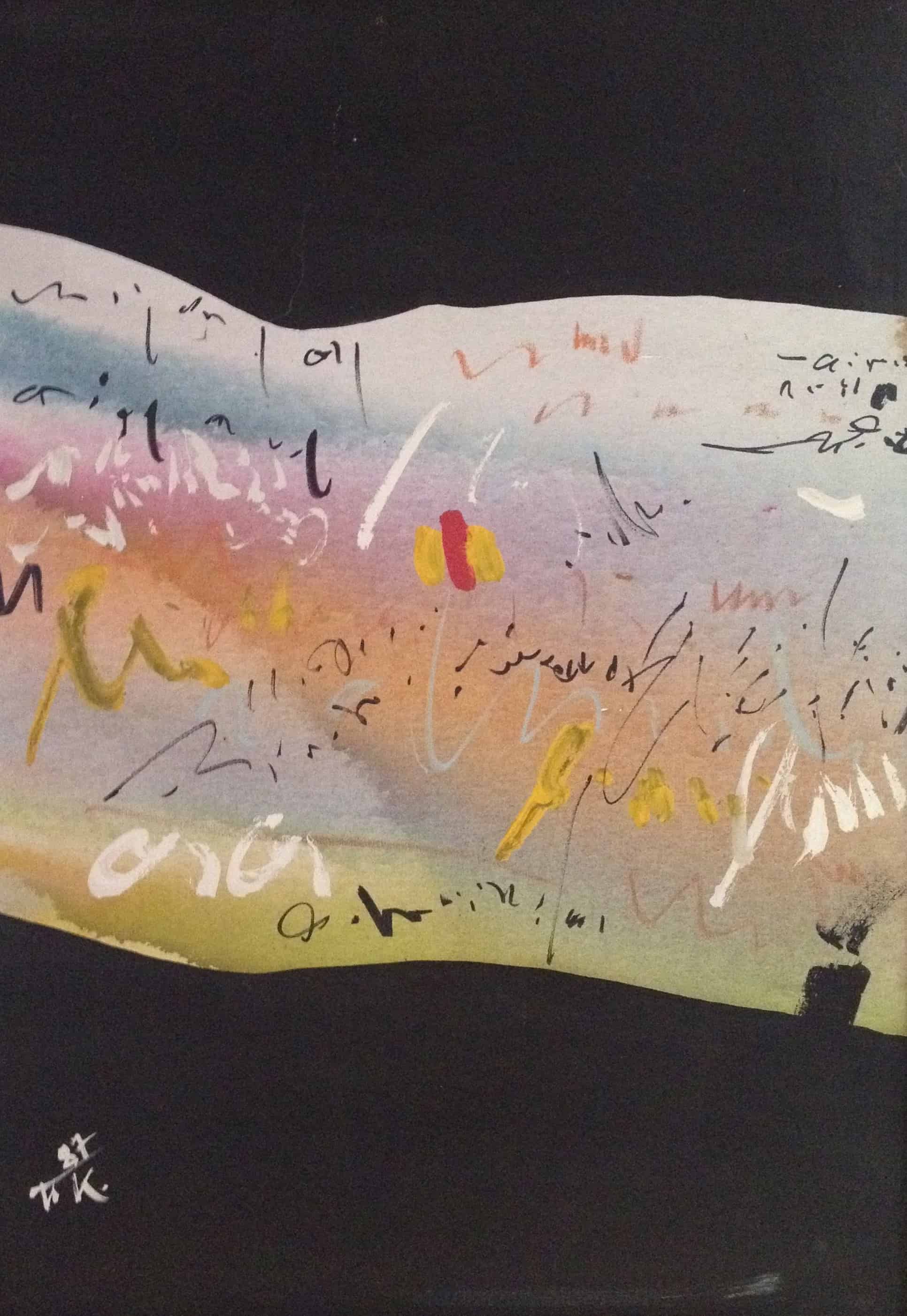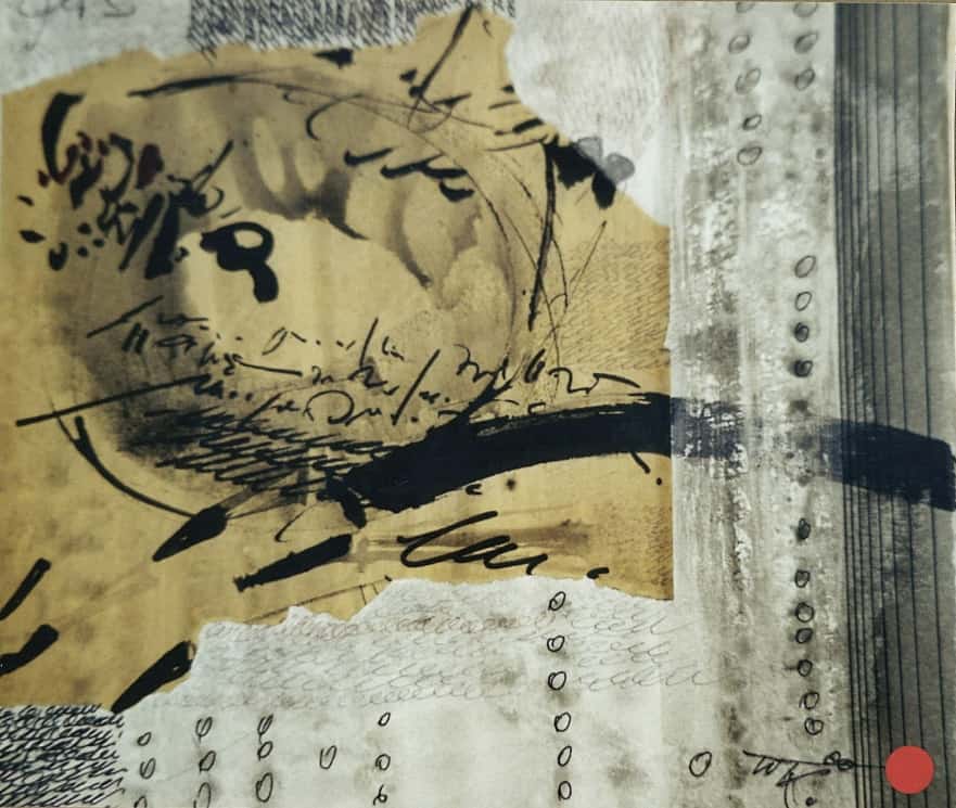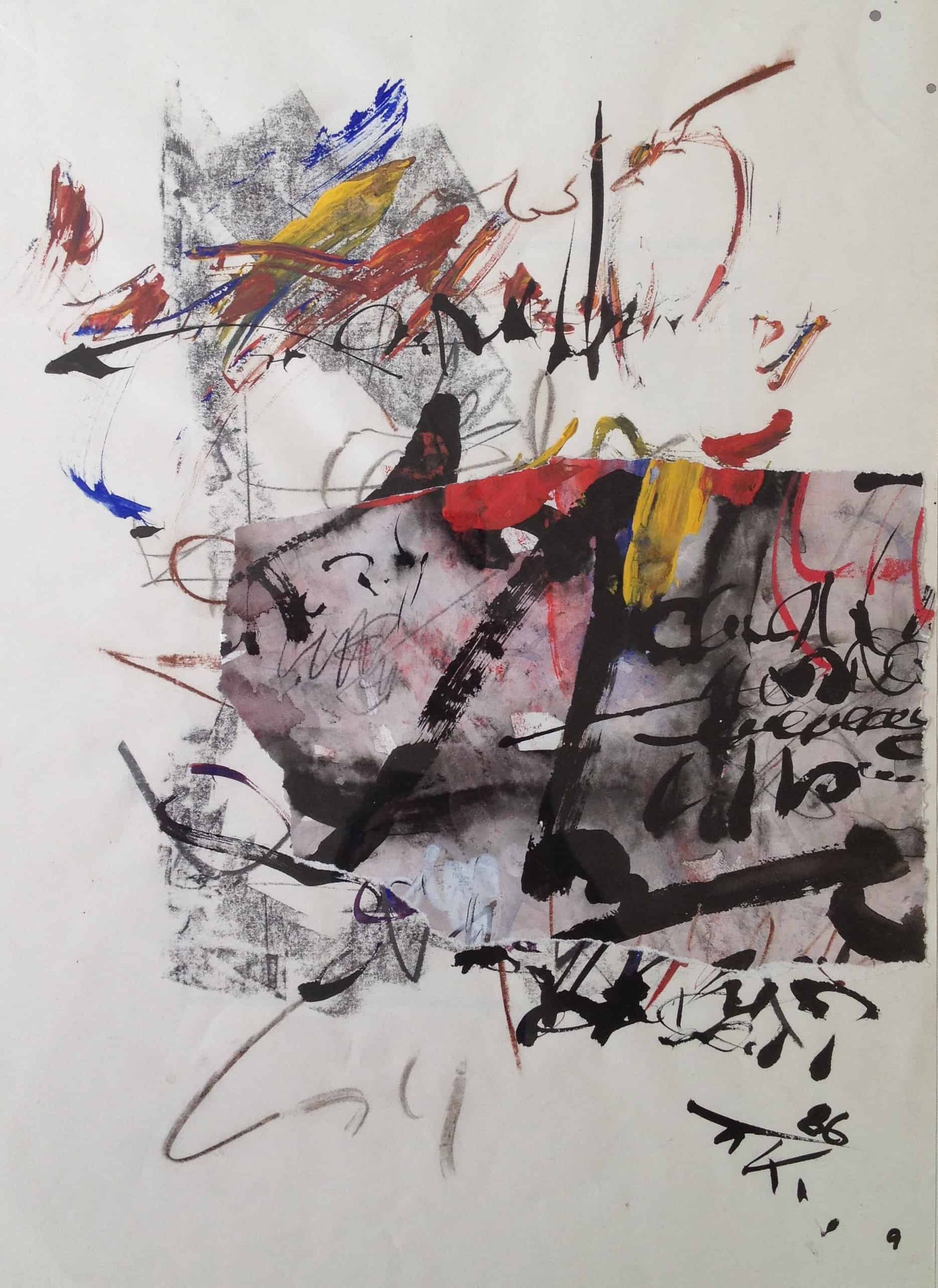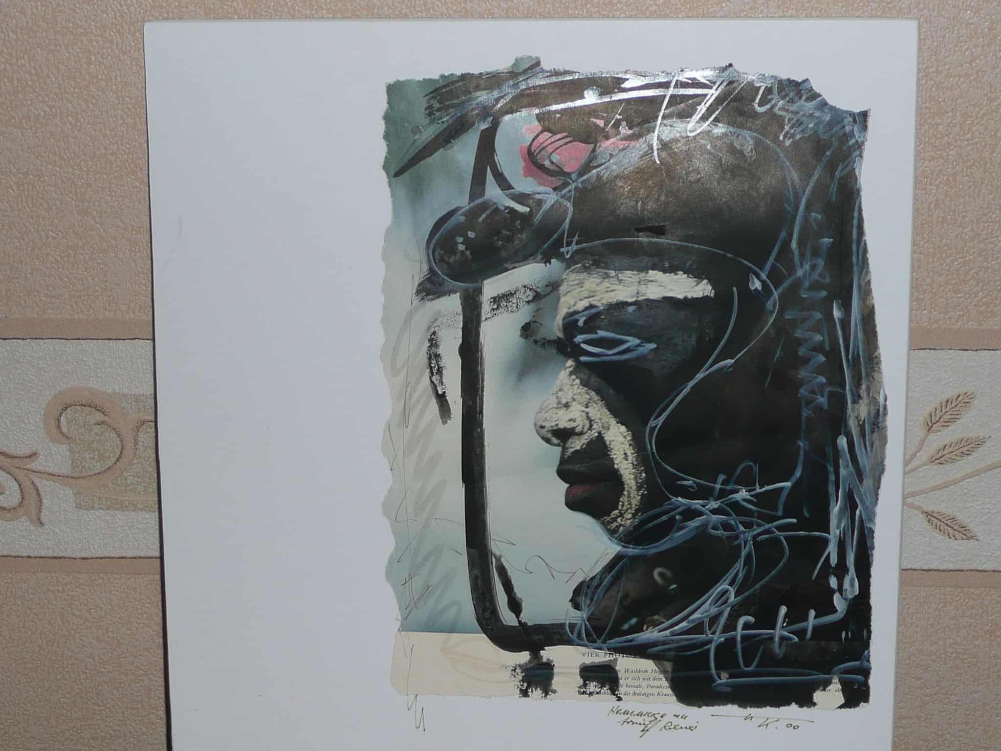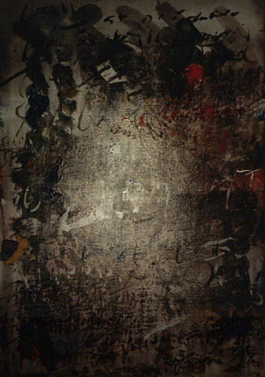Technik: bunter Farbcollage auf weißgestrichenem Packpapier, dieses geklebt auf mit Tusche schwarz grundierte Leinwand