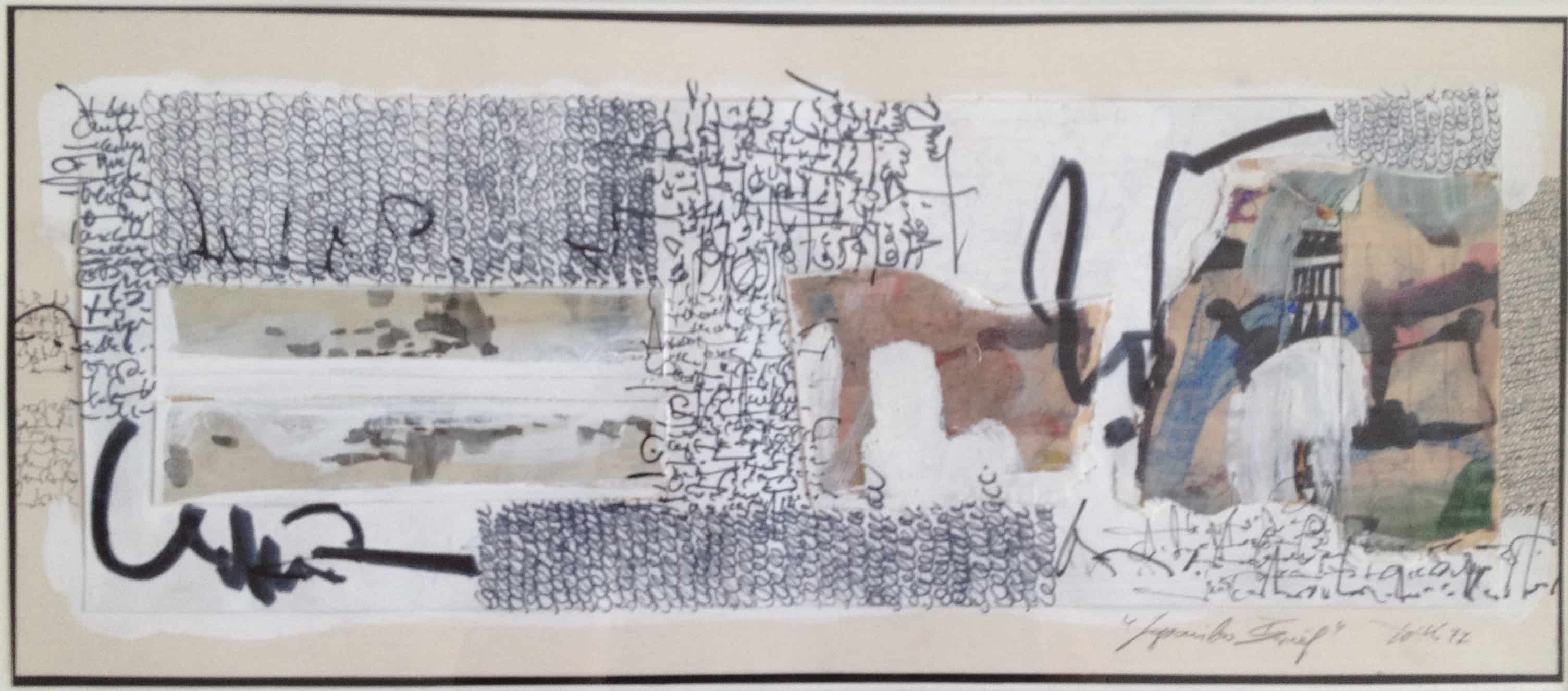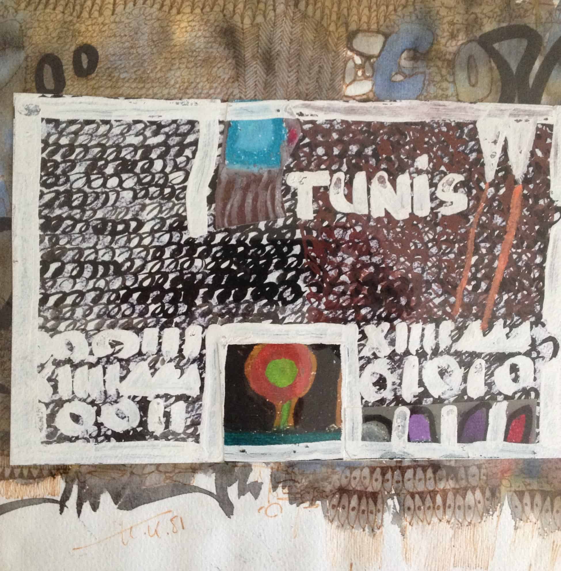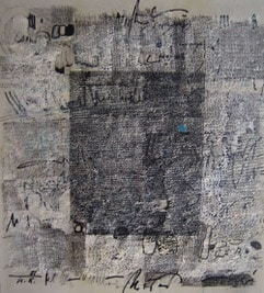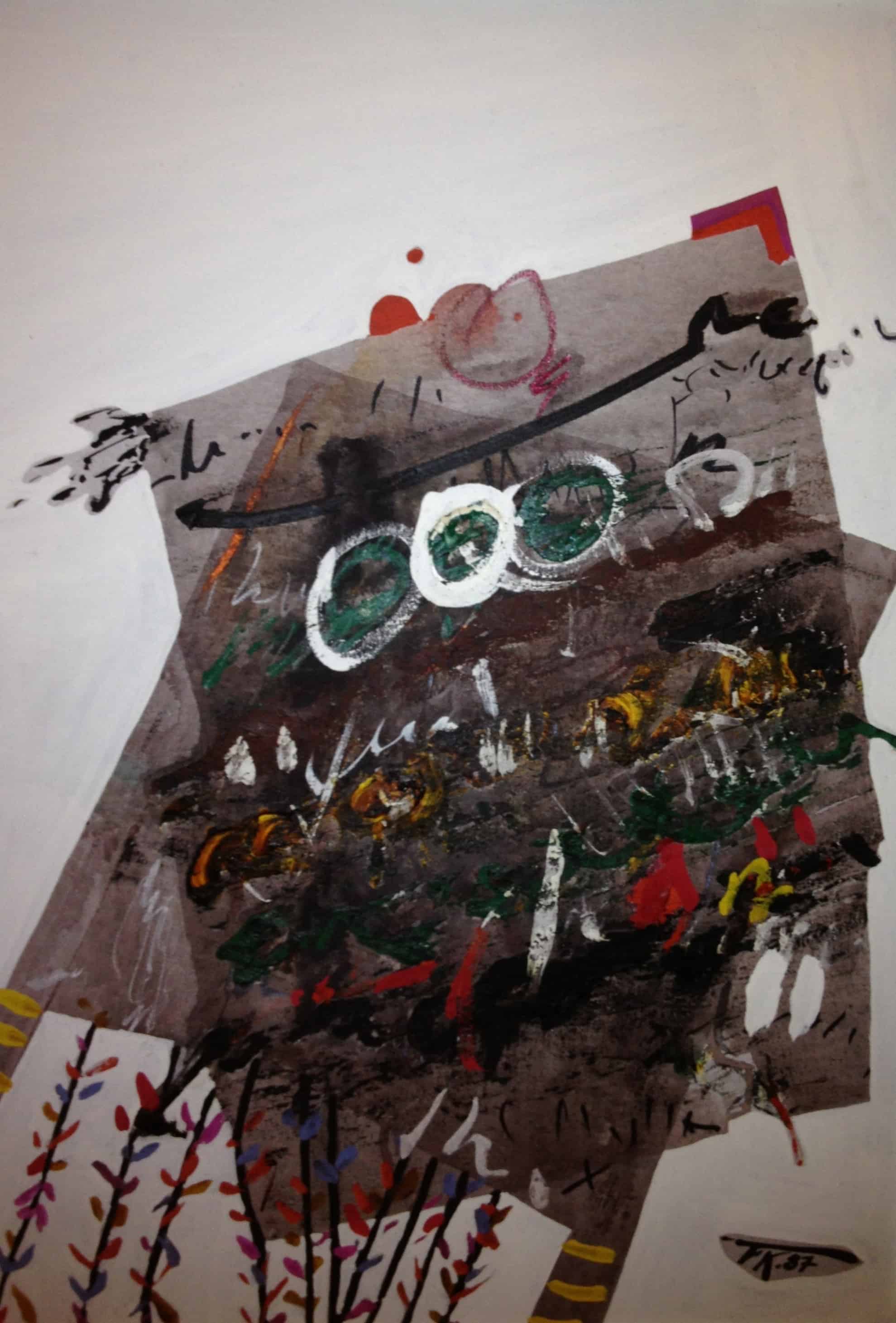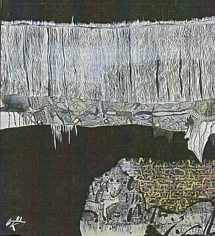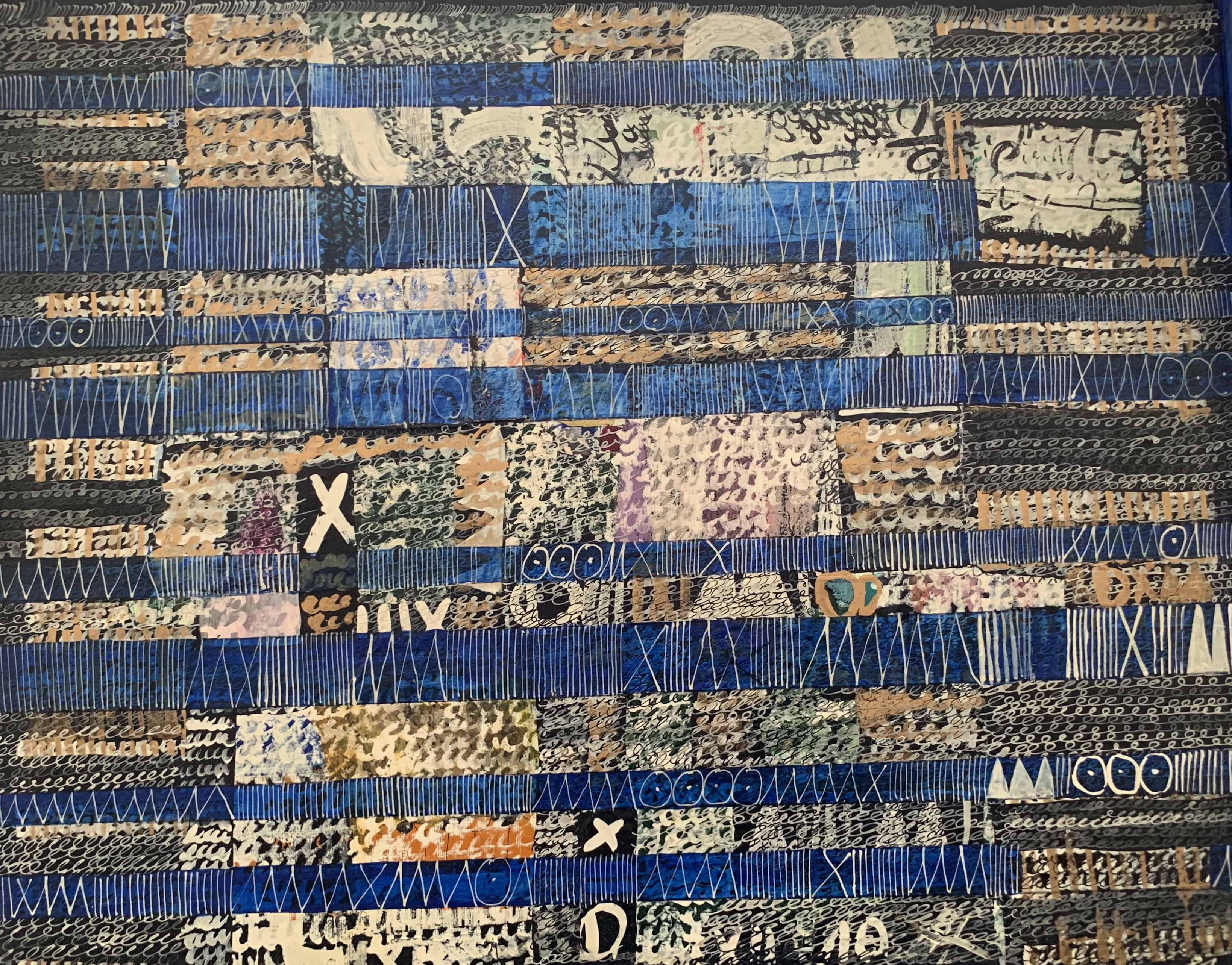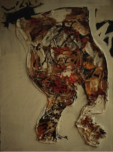Technik: bunter Farbcollage auf weißgestrichenem Packpapier, dieses geklebt auf mit Tusche schwarz grundierte Leinwand