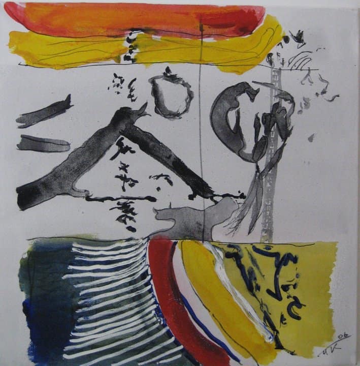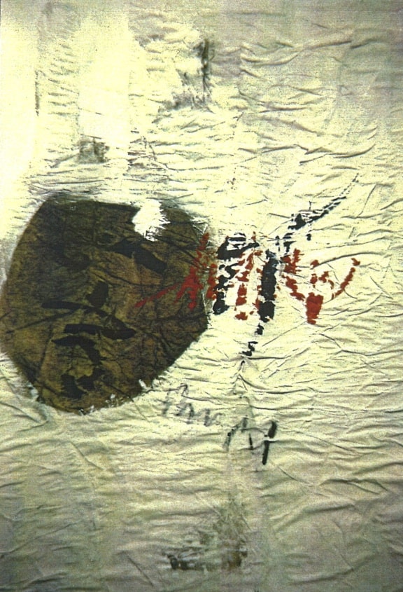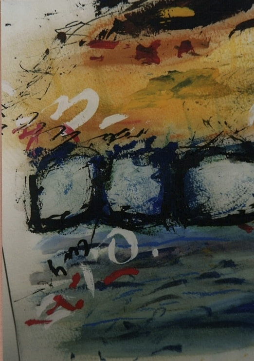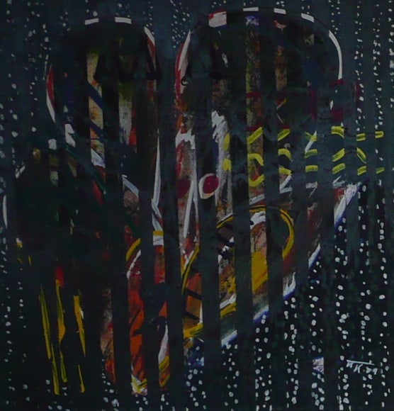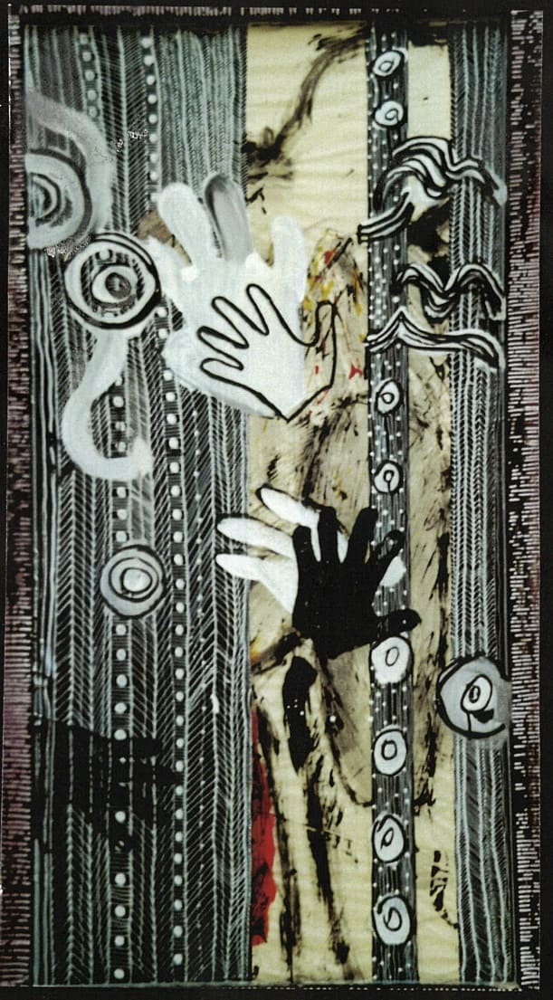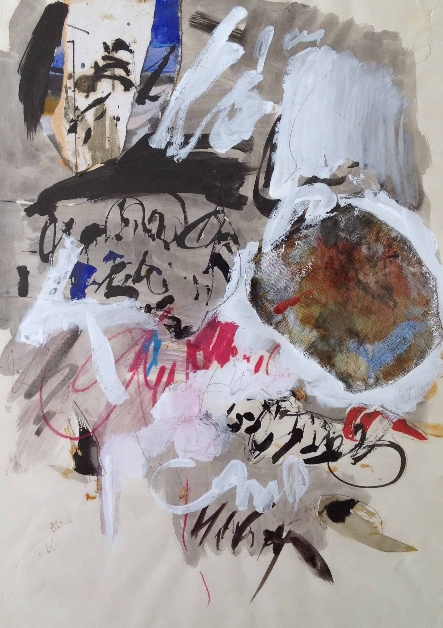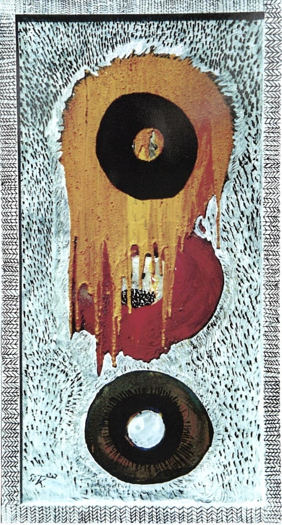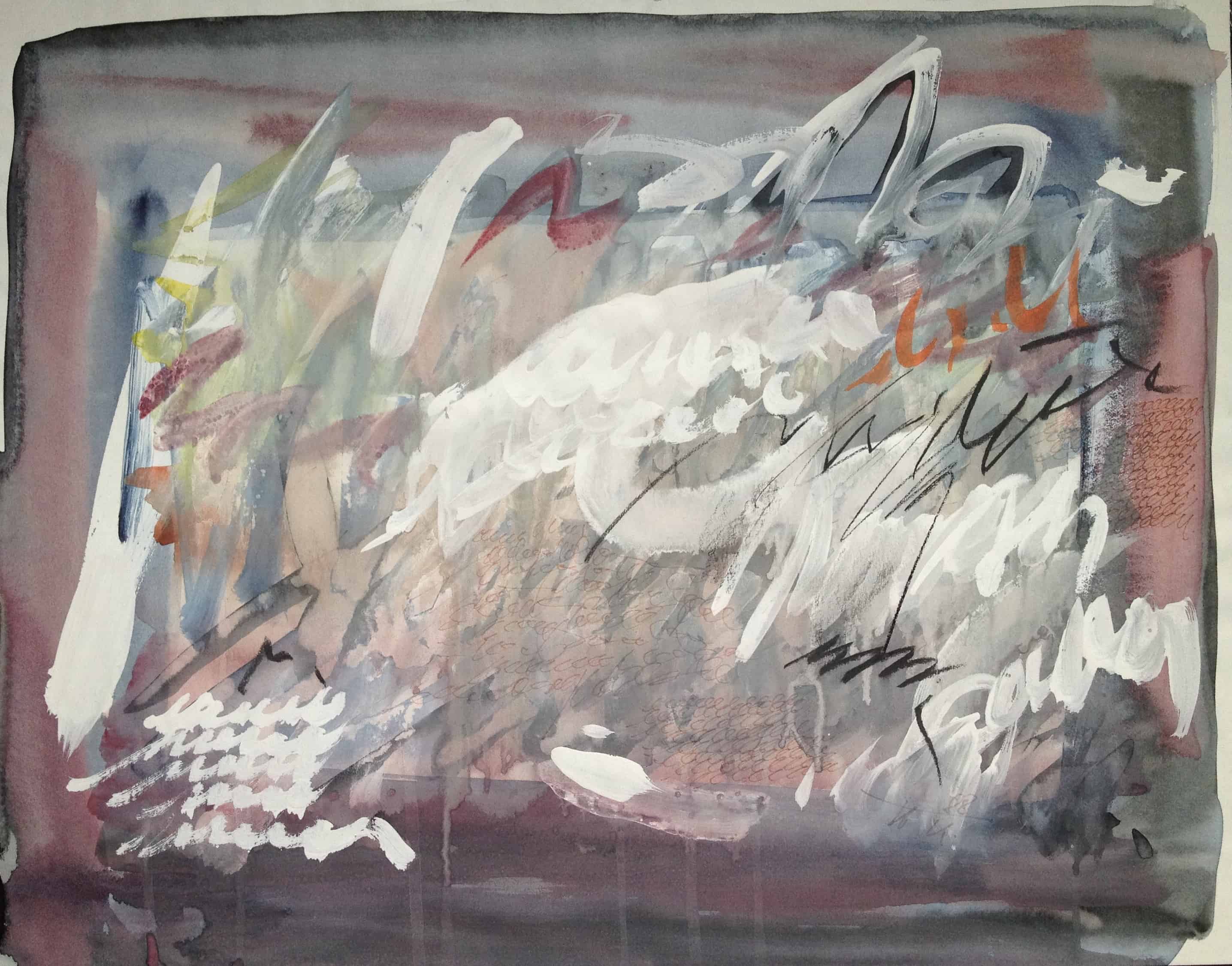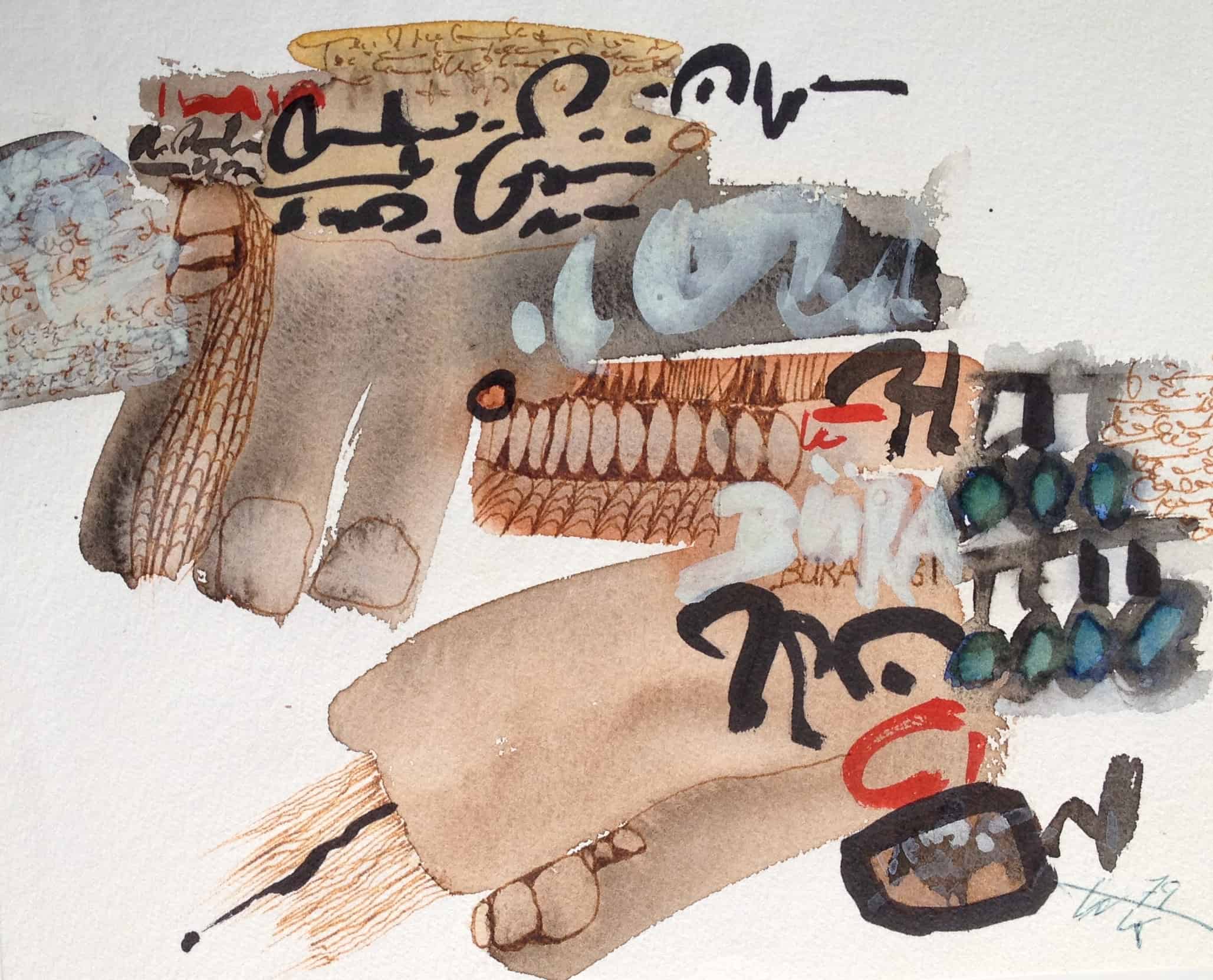 Technik: bunter Farbcollage auf weißgestrichenem Packpapier, dieses geklebt auf mit Tusche schwarz grundierte Leinwand