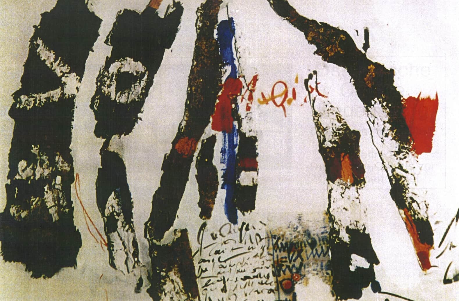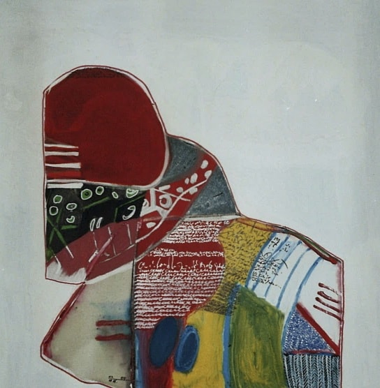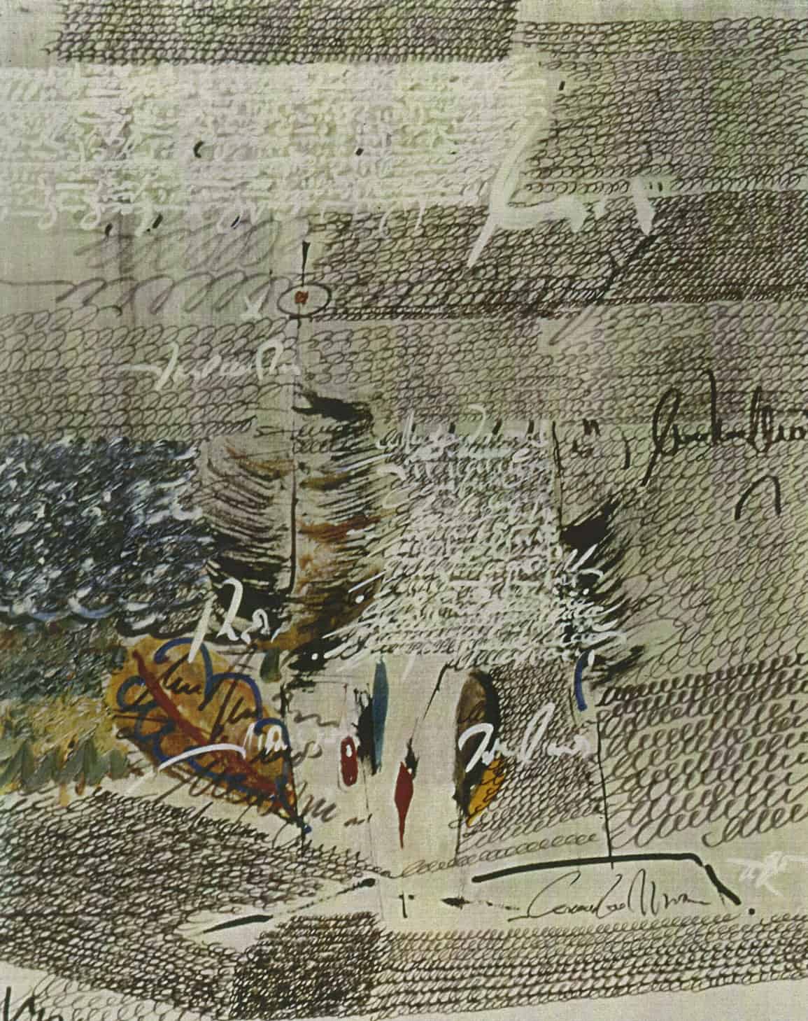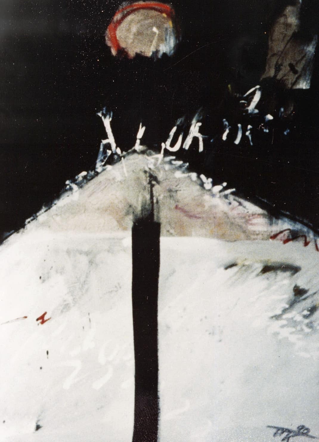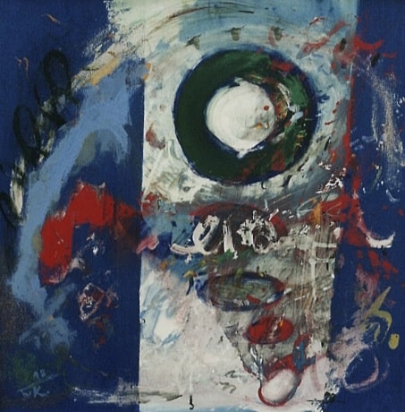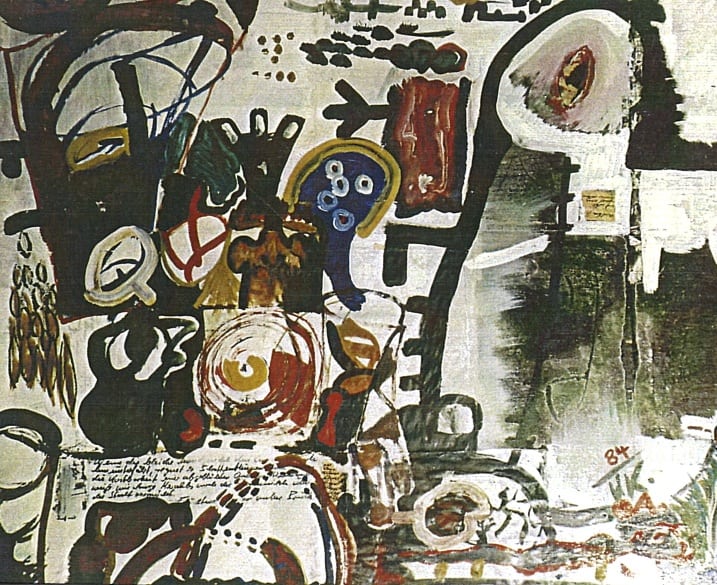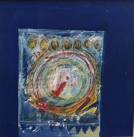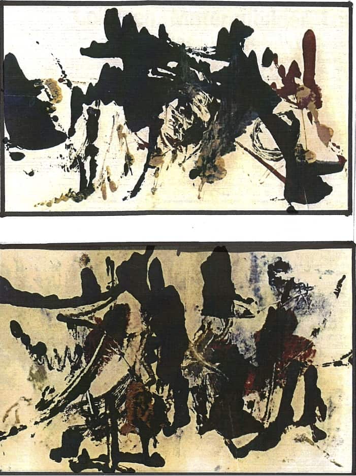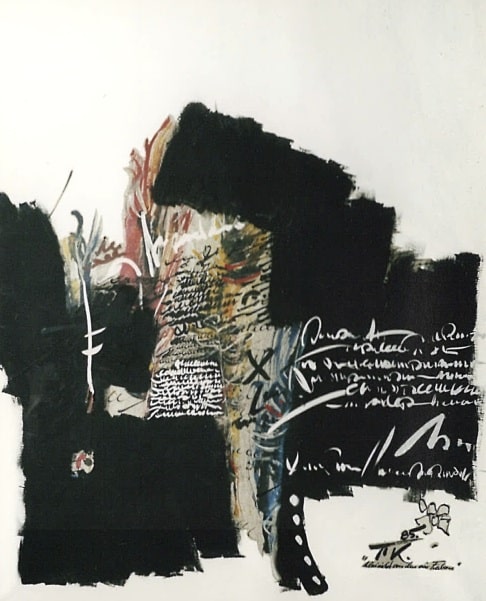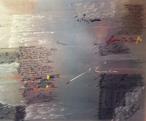 Technik: bunter Farbcollage auf weißgestrichenem Packpapier, dieses geklebt auf mit Tusche schwarz grundierte Leinwand