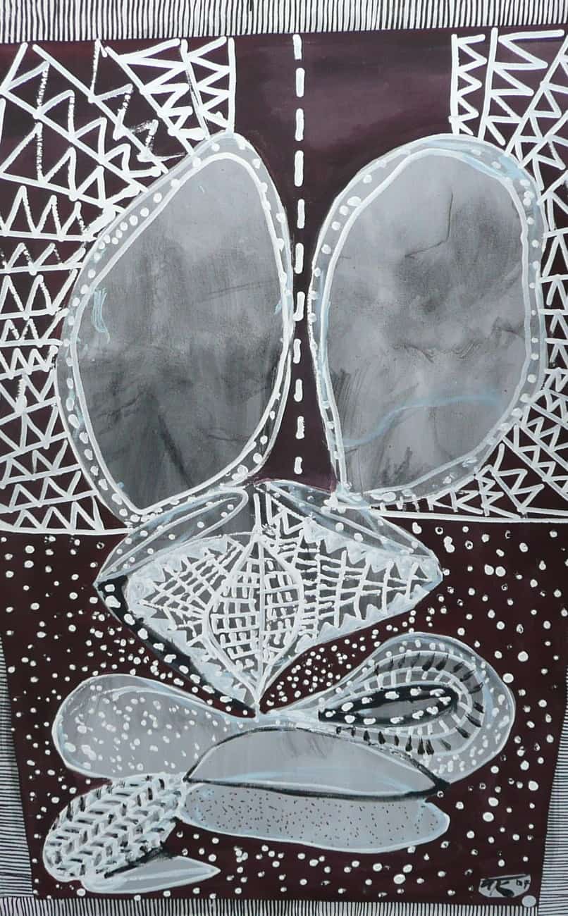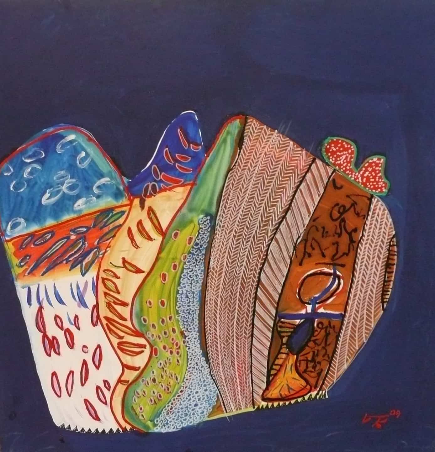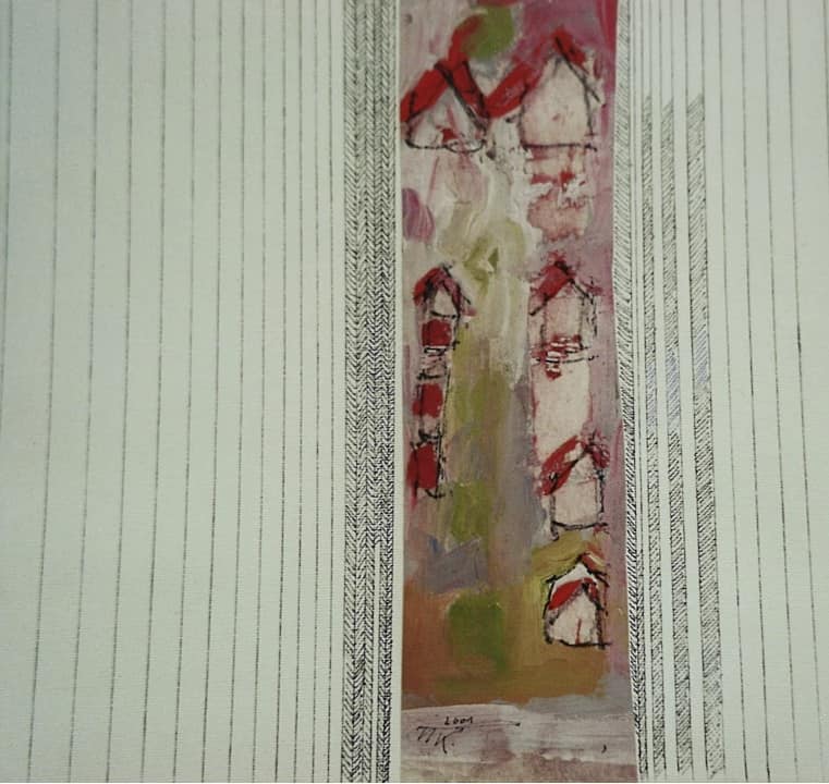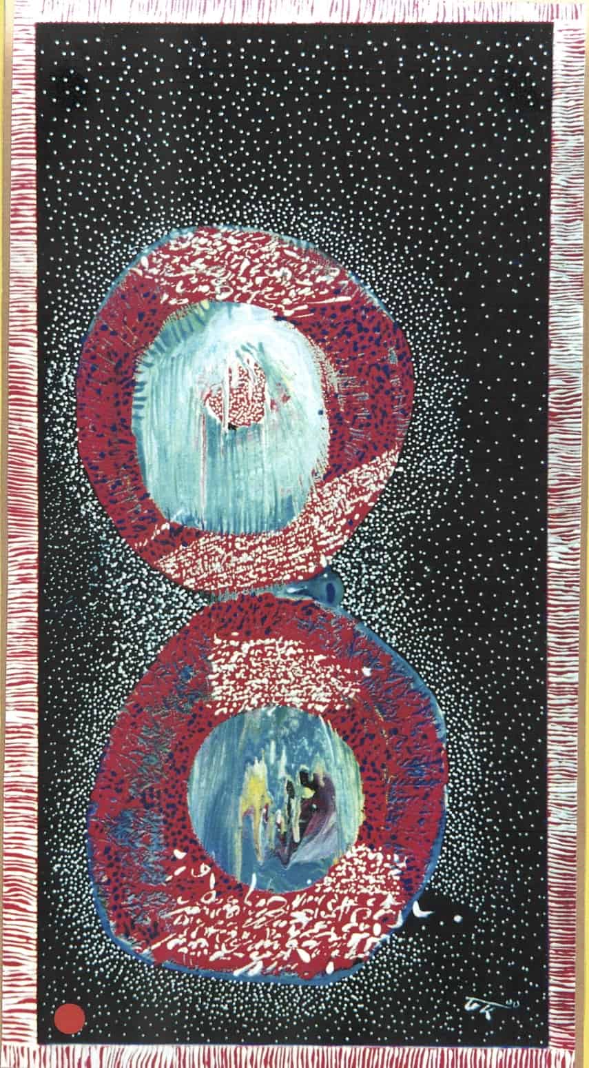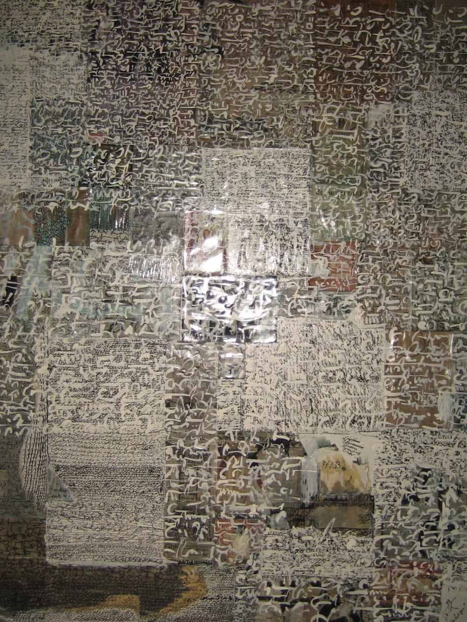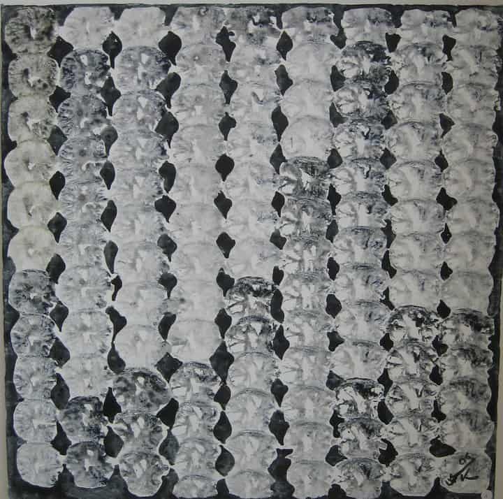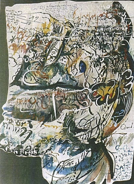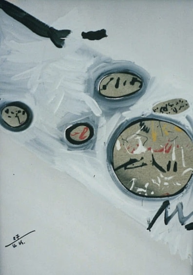 Technik: bunter Farbcollage auf weißgestrichenem Packpapier, dieses geklebt auf mit Tusche schwarz grundierte Leinwand