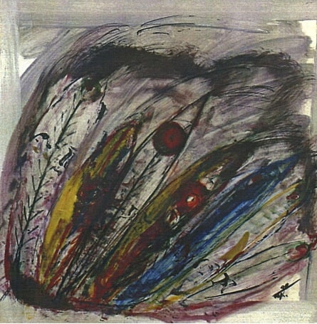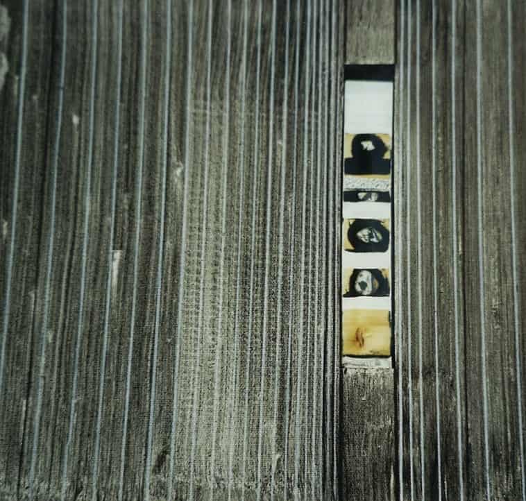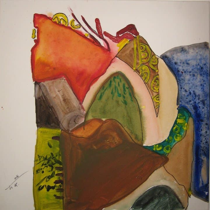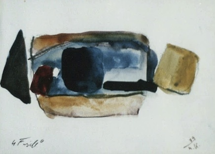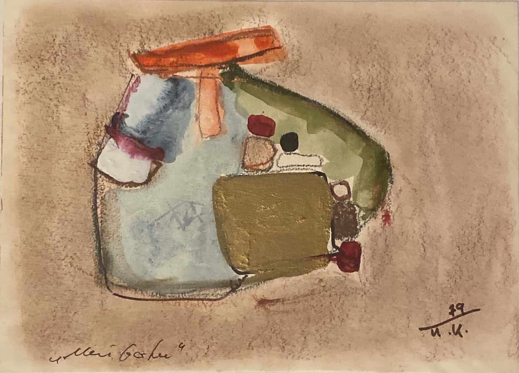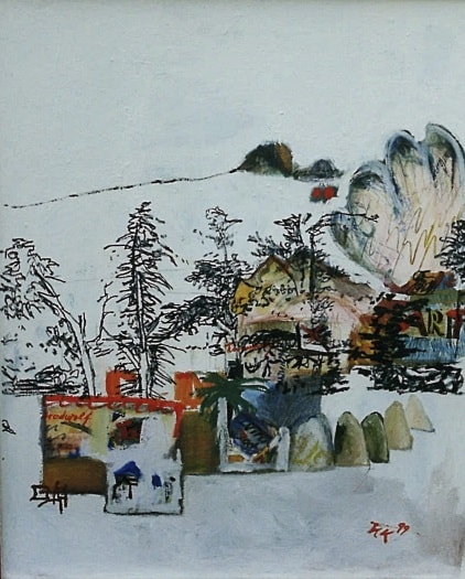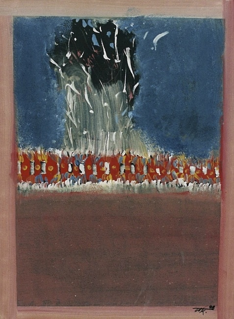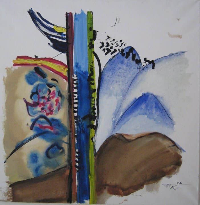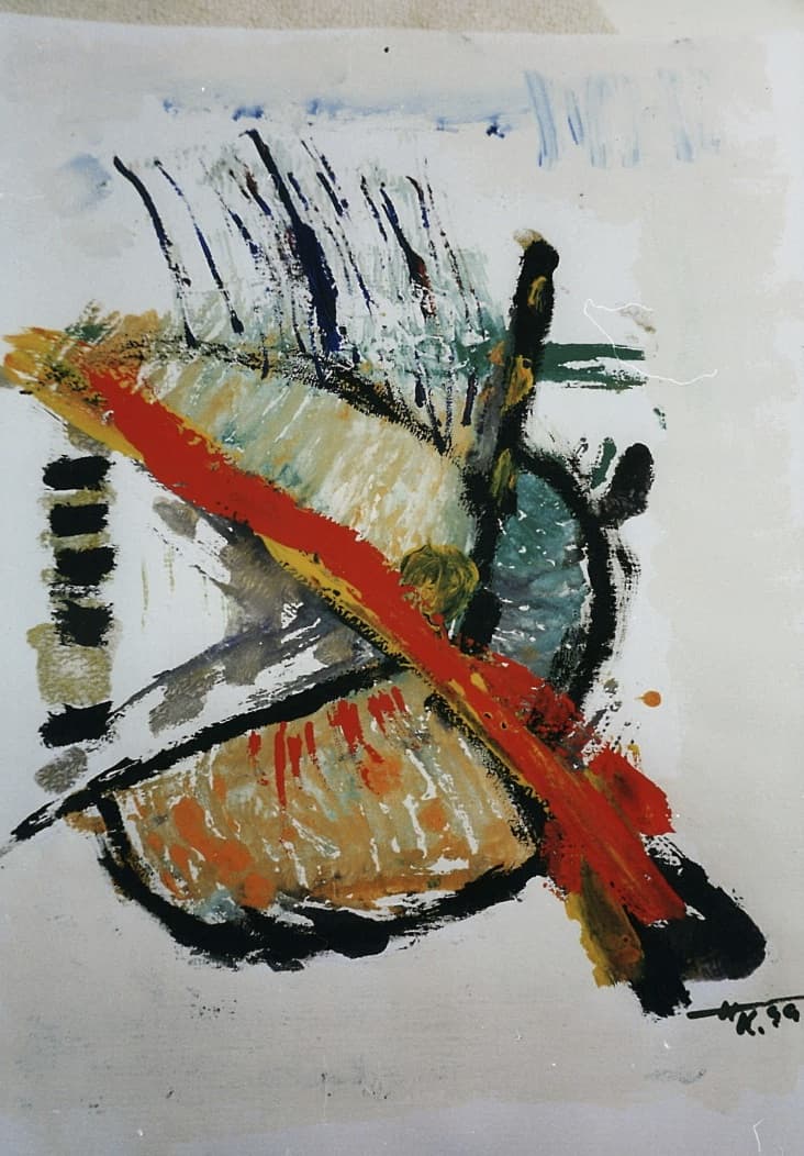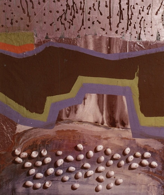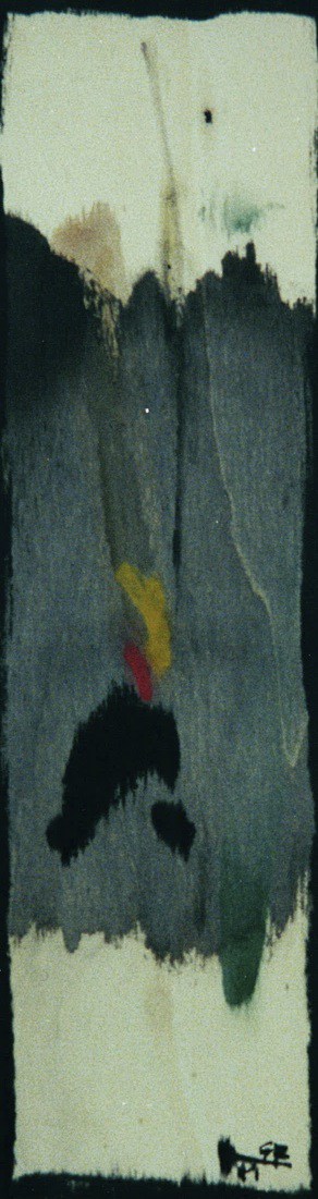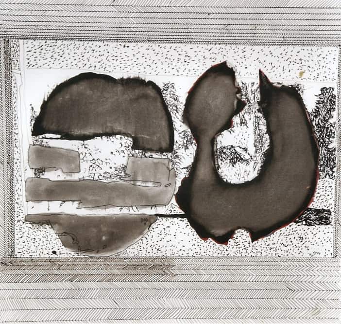 Technik: bunter Farbcollage auf weißgestrichenem Packpapier, dieses geklebt auf mit Tusche schwarz grundierte Leinwand