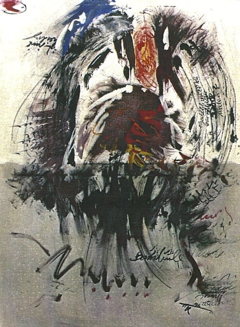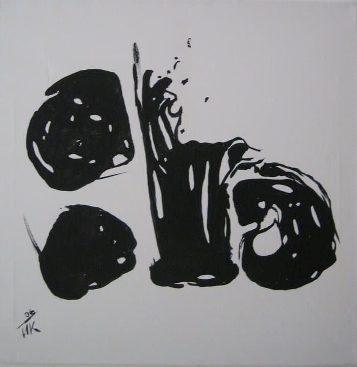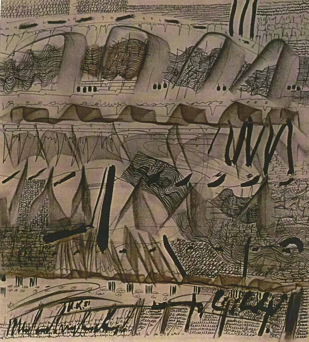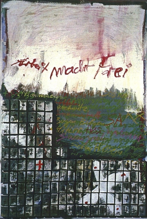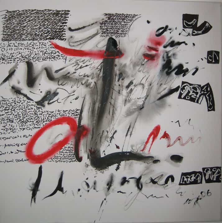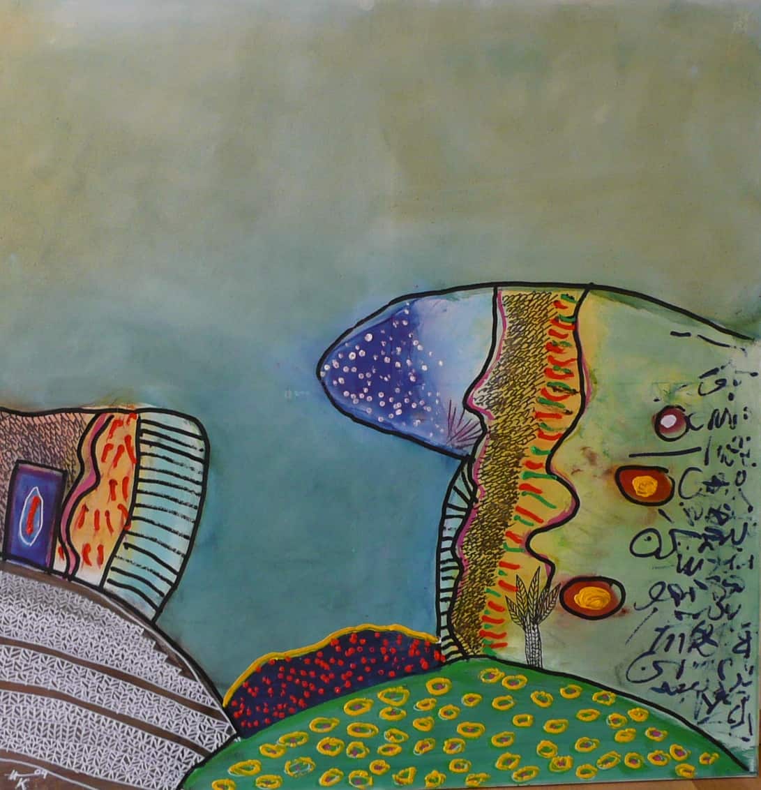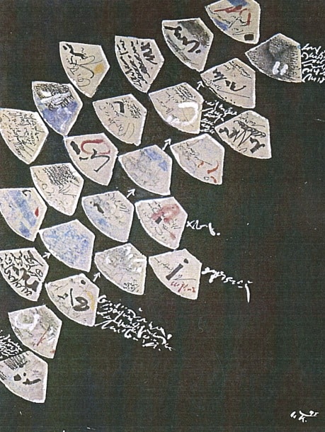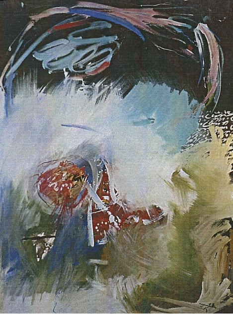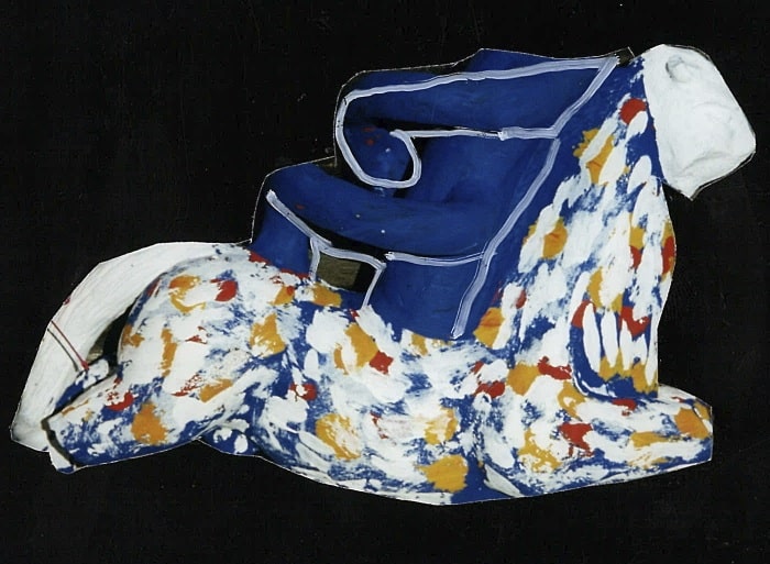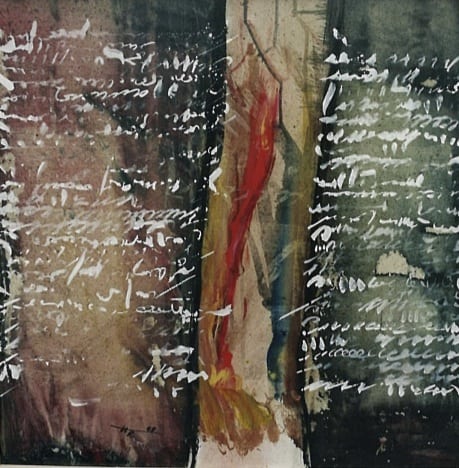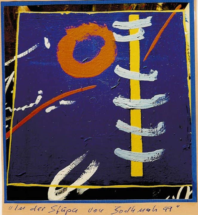 Technik: bunter Farbcollage auf weißgestrichenem Packpapier, dieses geklebt auf mit Tusche schwarz grundierte Leinwand