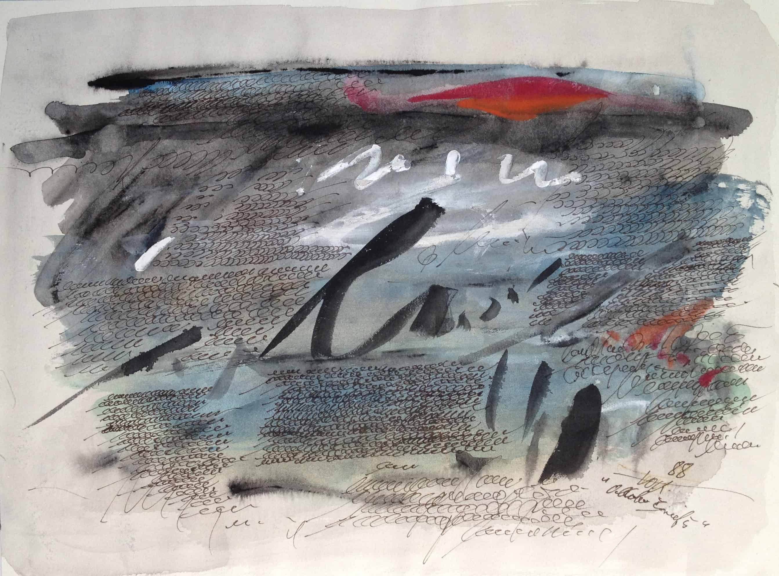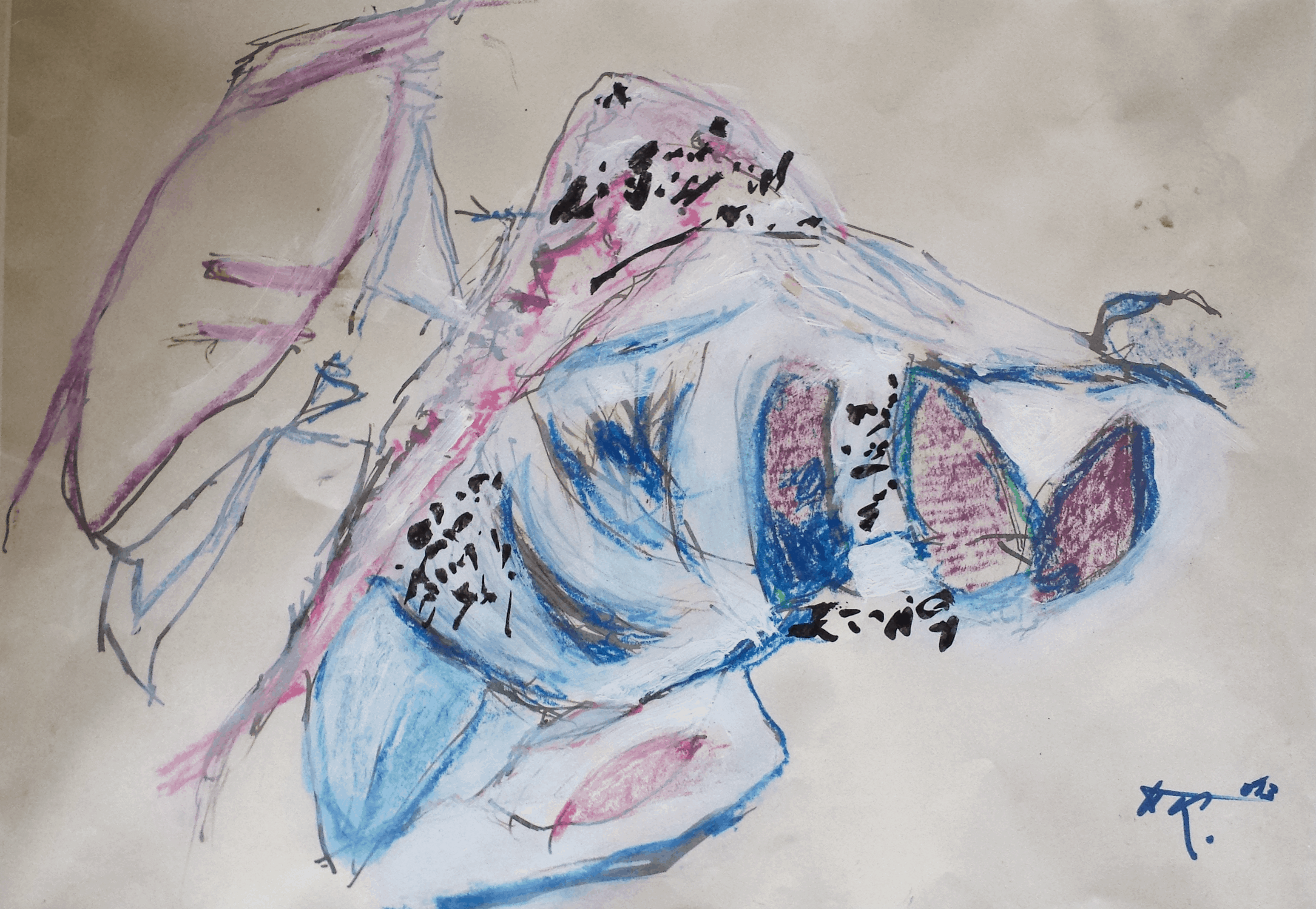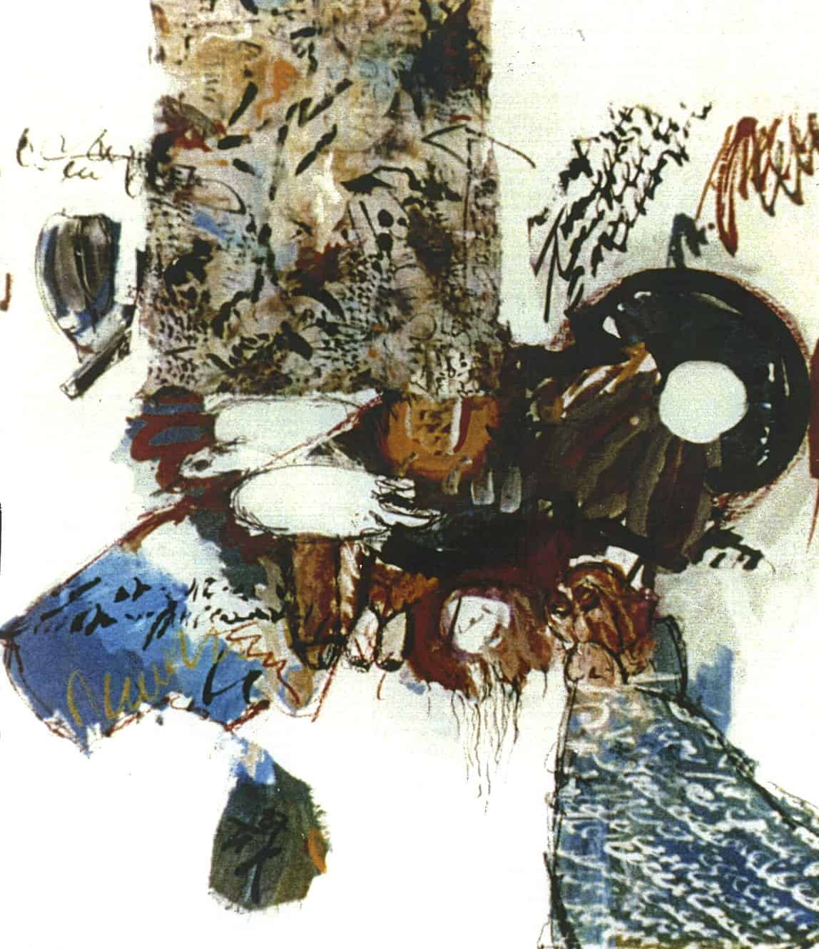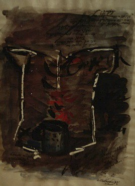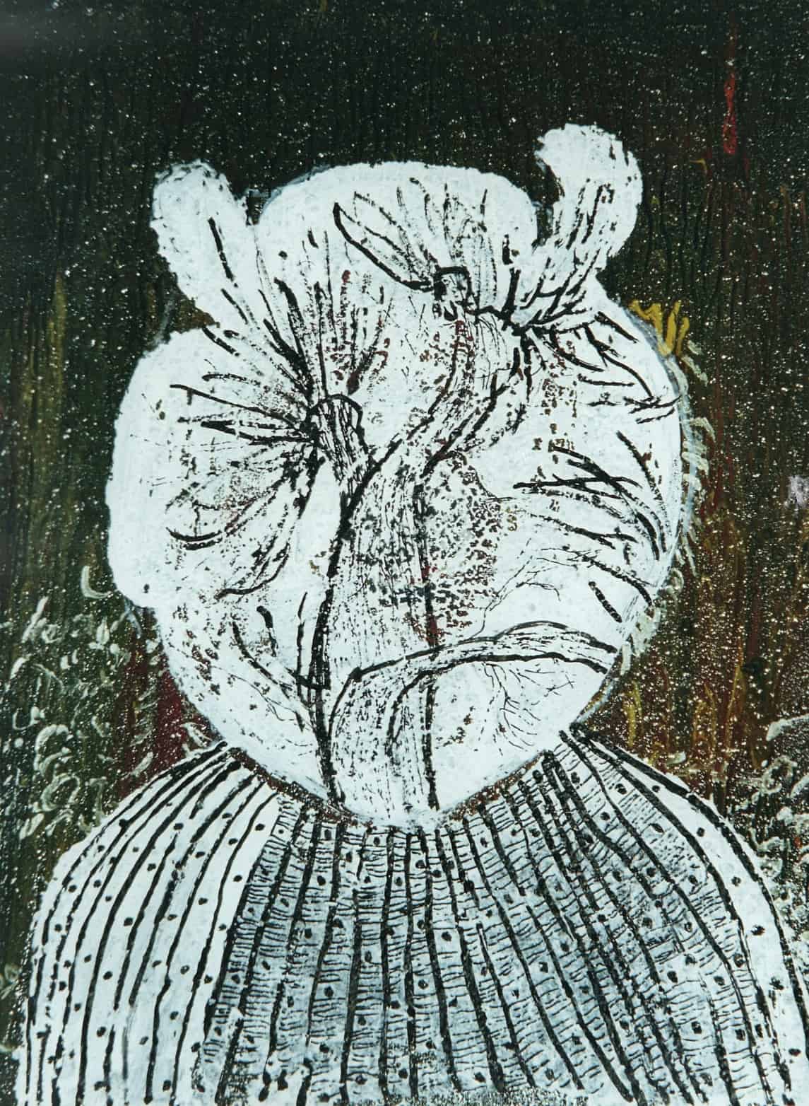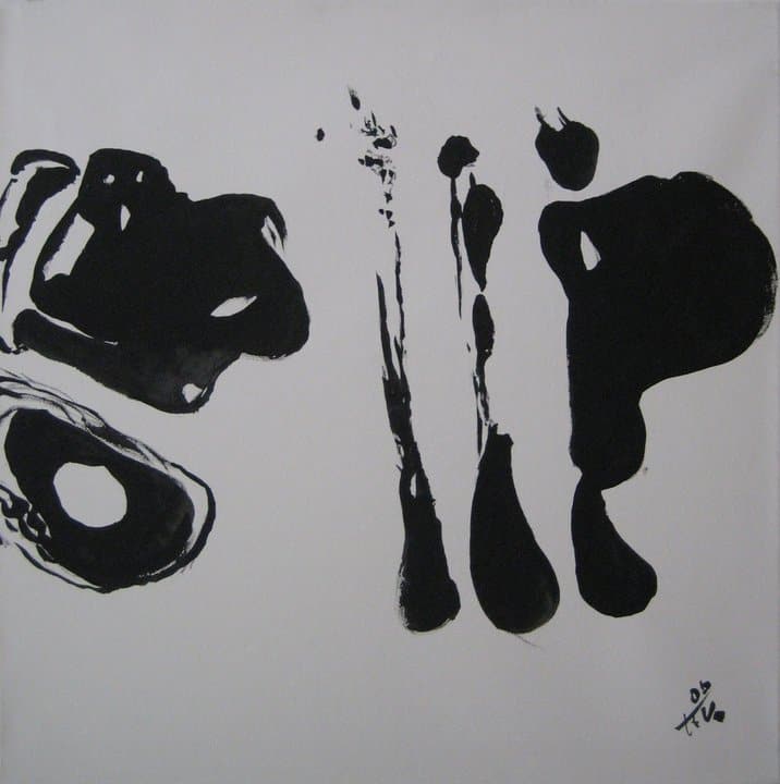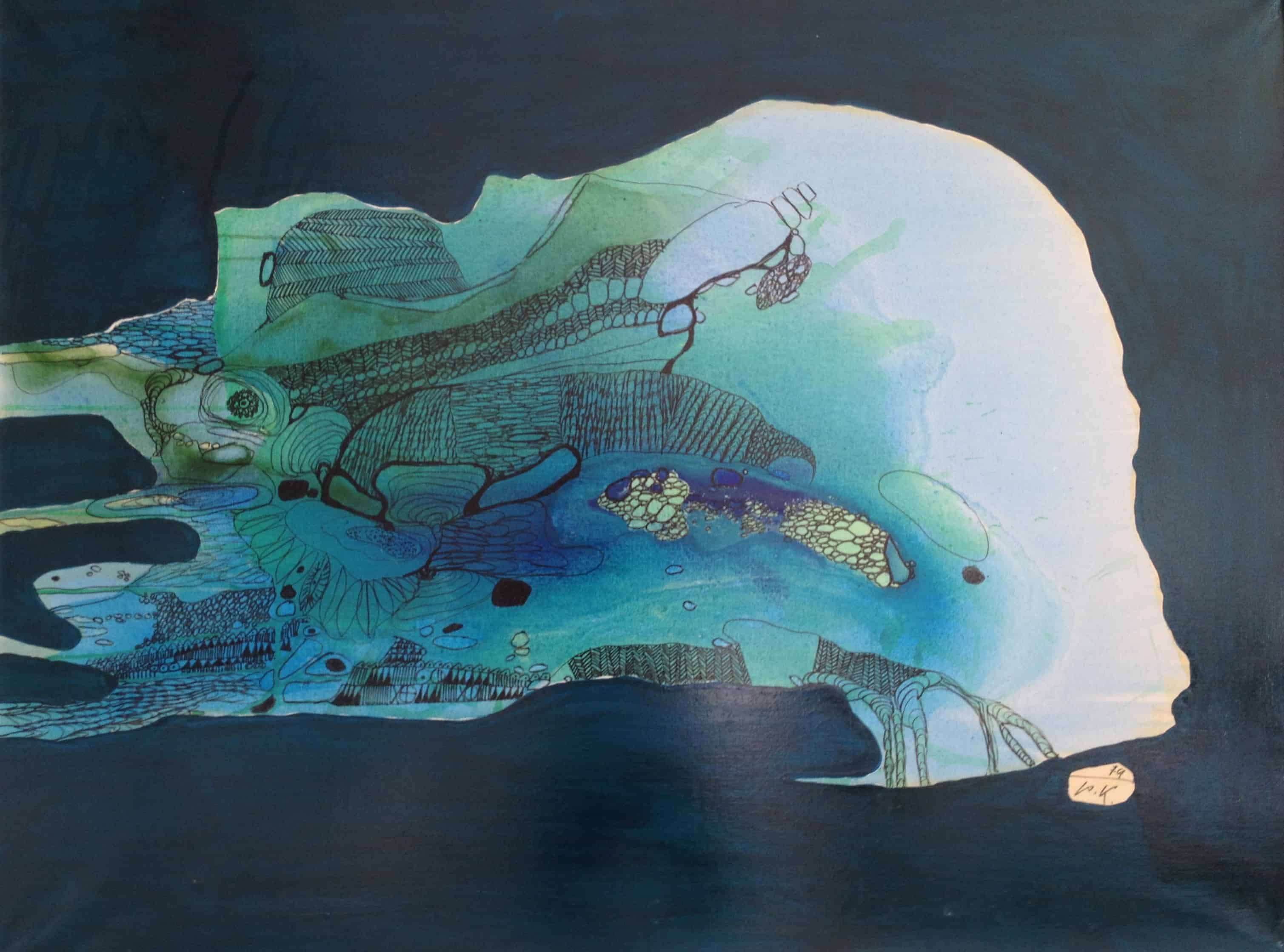Technik: bunter Farbcollage auf weißgestrichenem Packpapier, dieses geklebt auf mit Tusche schwarz grundierte Leinwand