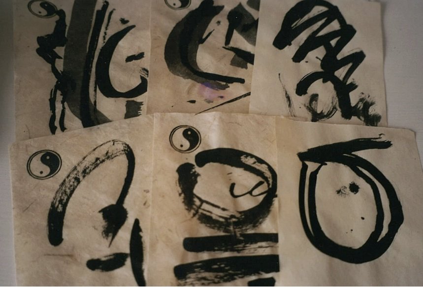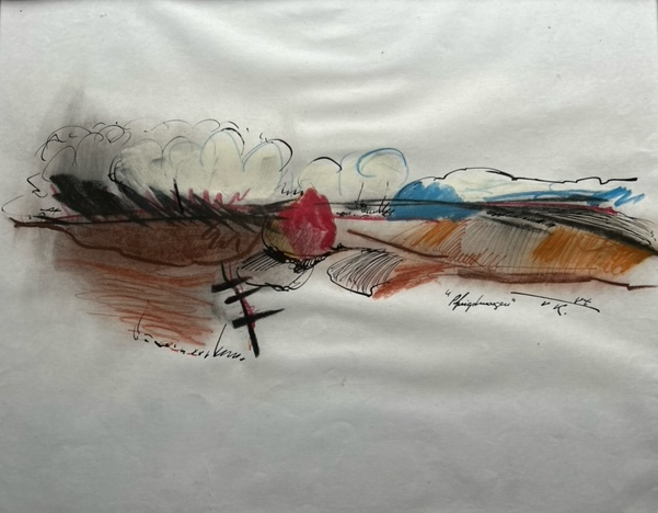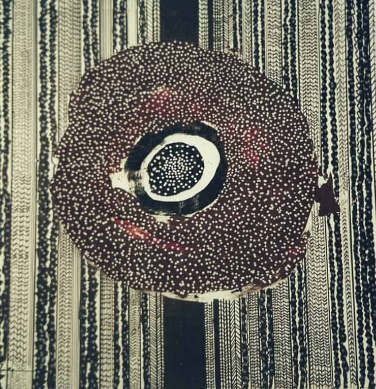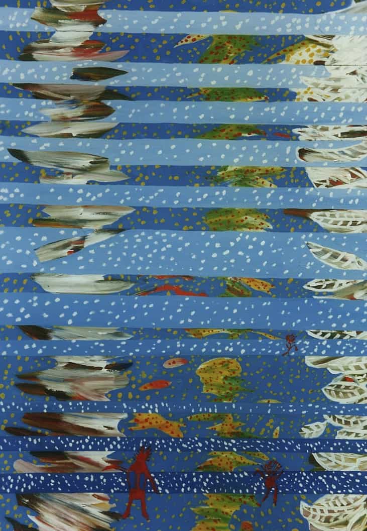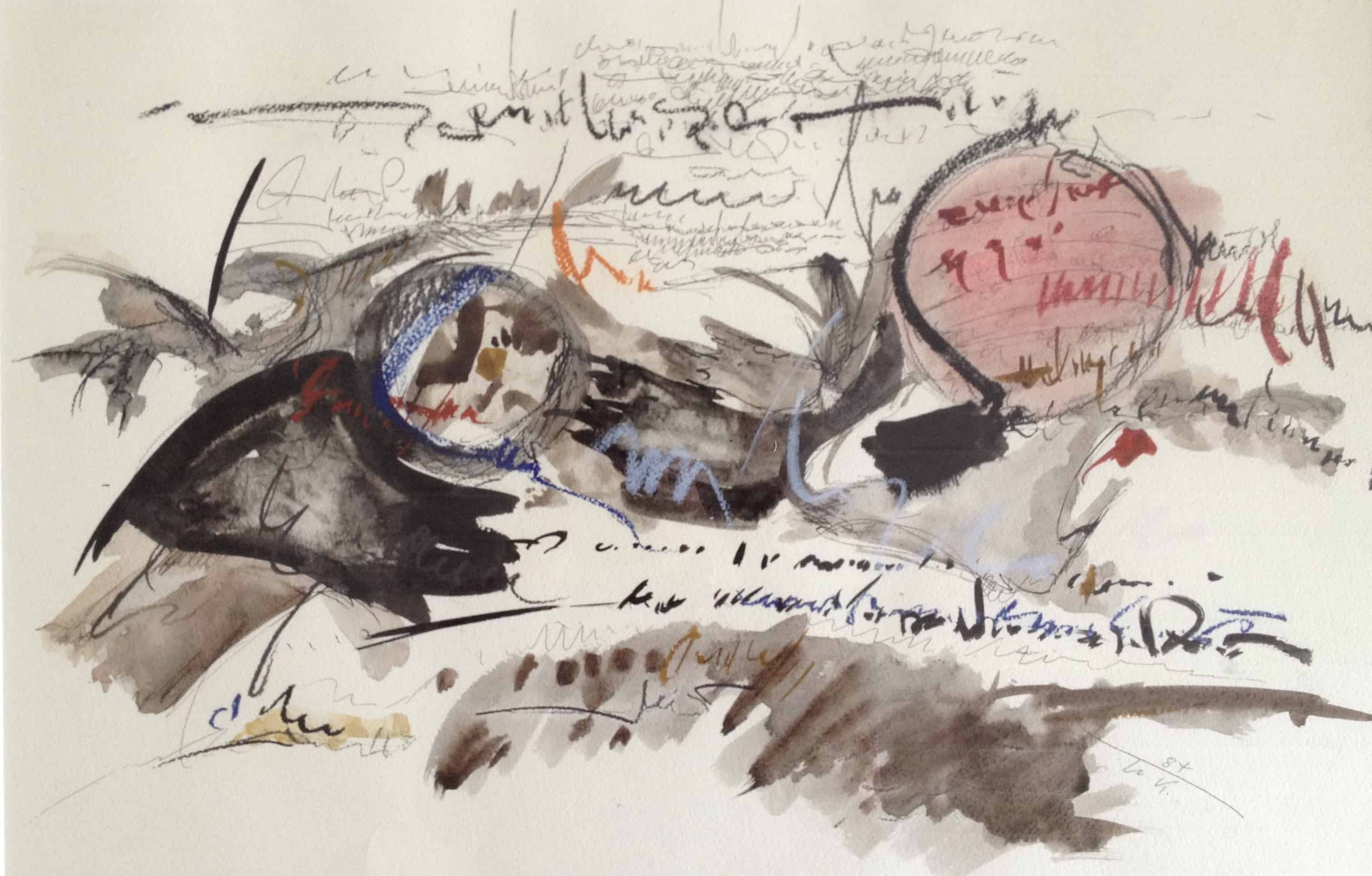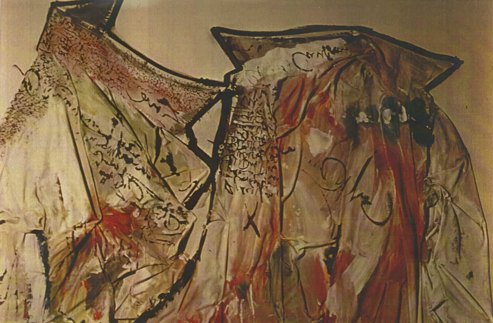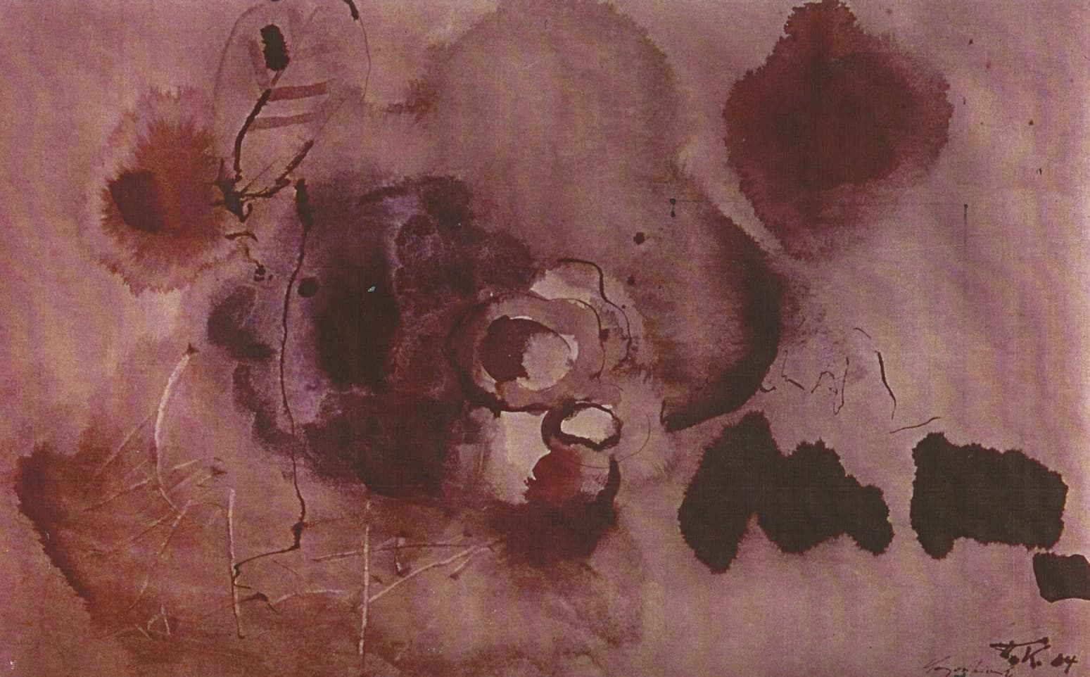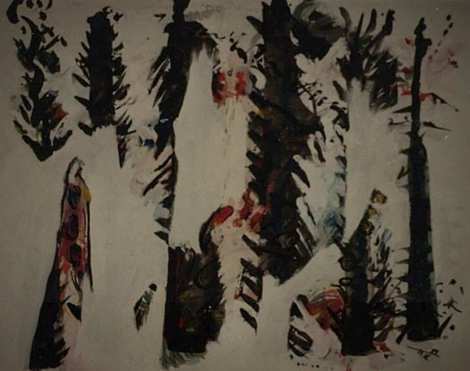 Technik: bunter Farbcollage auf weißgestrichenem Packpapier, dieses geklebt auf mit Tusche schwarz grundierte Leinwand